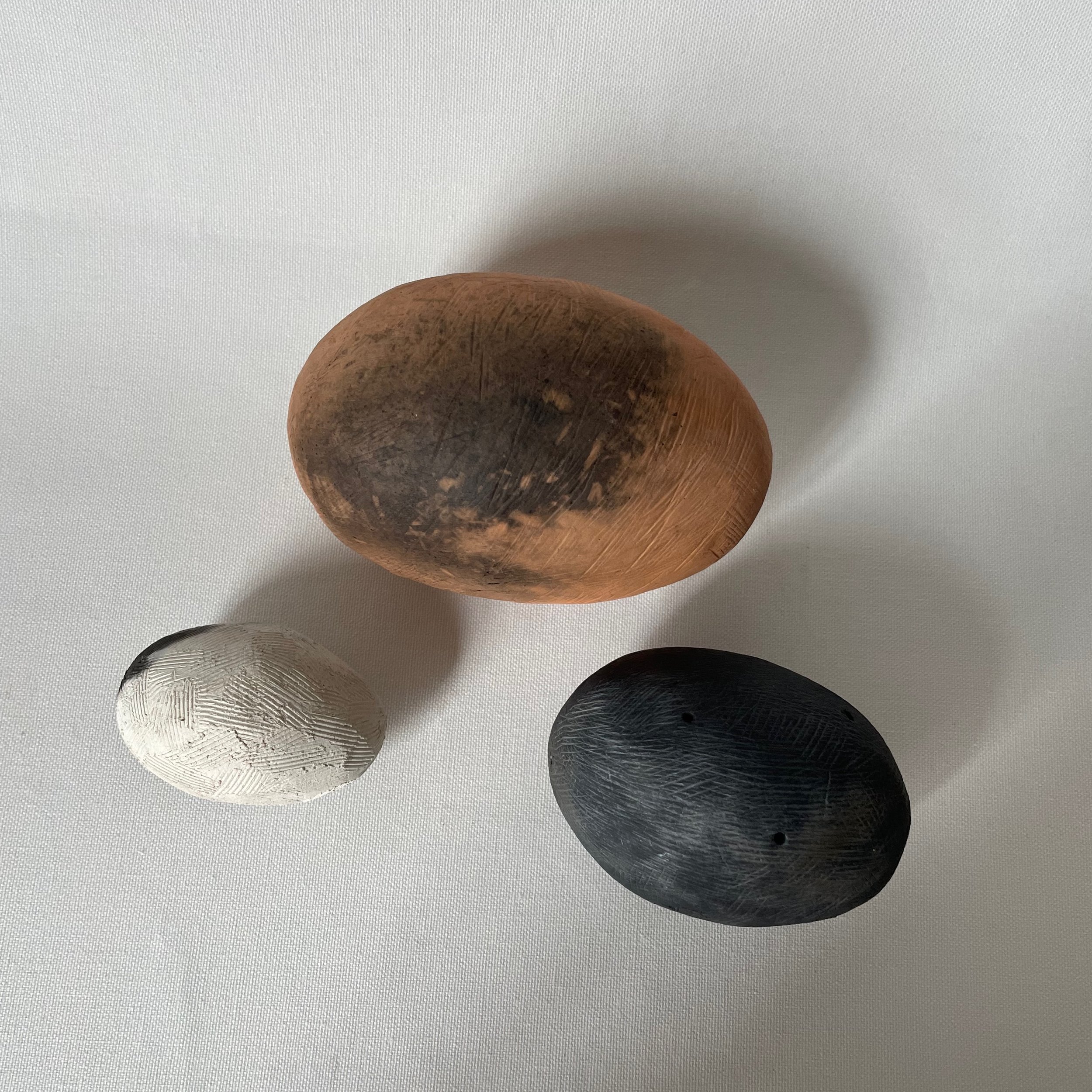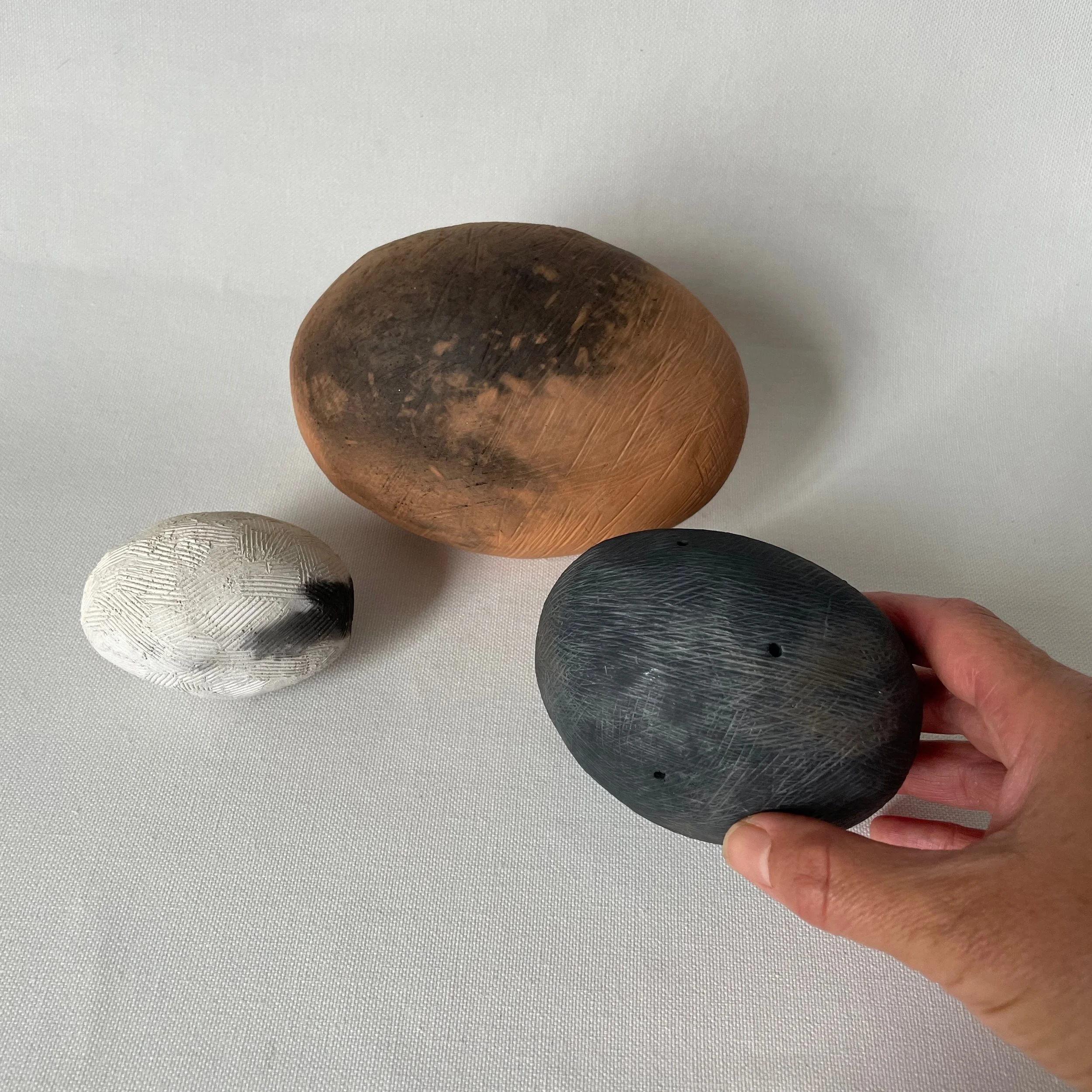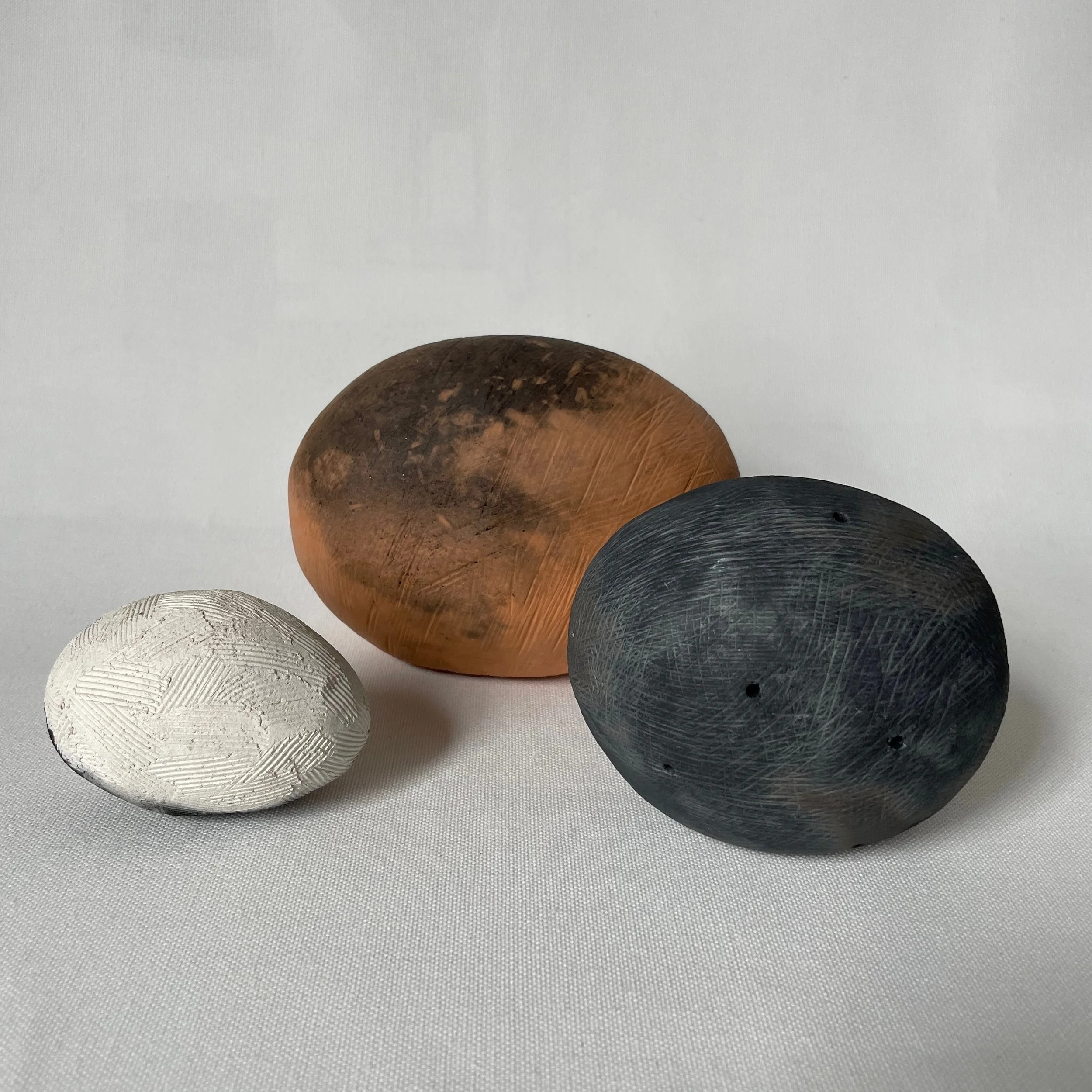 three stonesThree Earthenware ‘stones’ pit fired | Winter 2023 Available for purchase as a group | POA Slide 1 Slide 1 (current slide) Slide 2 Slide 2 (current slide) Slide 3 Slide 3 (current slide)